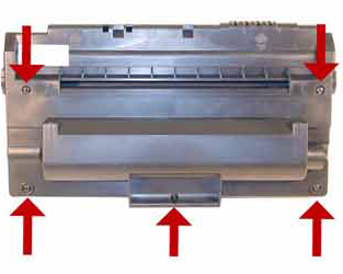 Une fois les visses enlevées, attaquez vous aux languettes se situant sur le côté. Faites les rentrer en appuyant dessus. Vous trouverez aussi des languettes situées vers le manche de la cartouche. Faites les aussi entrer en appliquant une pression , le tout avec délicatesse! Une fois les visses et les languettes sorties et rentrées, vous pourrez alors enlever le tout. Profitez en pour nettoyer les restes de toner qui traineraient encore dans la cartouche.