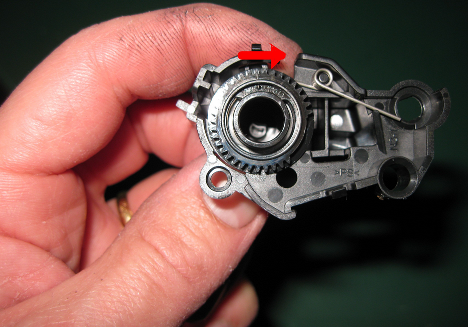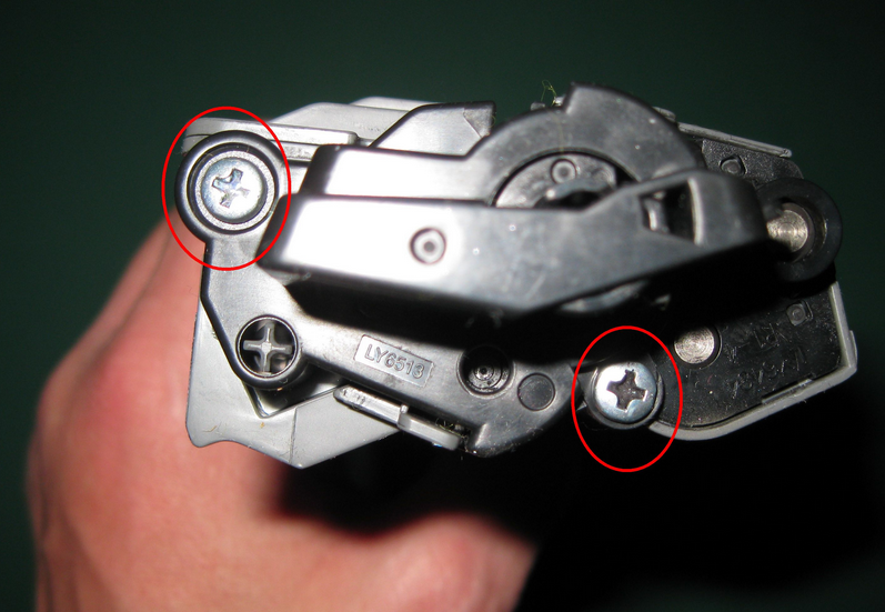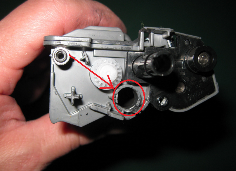 Repérez ensuite le trou de remplissage. Munissez vous de vos pinces et enlevez le bouchon du trou. Profitez-en par la suite pour vider la cartouche des restes de toner s’y trouvant. Videz les restes dans un sac poubelle et vous pourrez ensuite reprendre le cours de l’opération. ATTENTION, la petite roue dentée blanche tombe généralement dans la poubelle quand vous videz la cartouche. Mettez la de côté avant de vider votre cartouche.